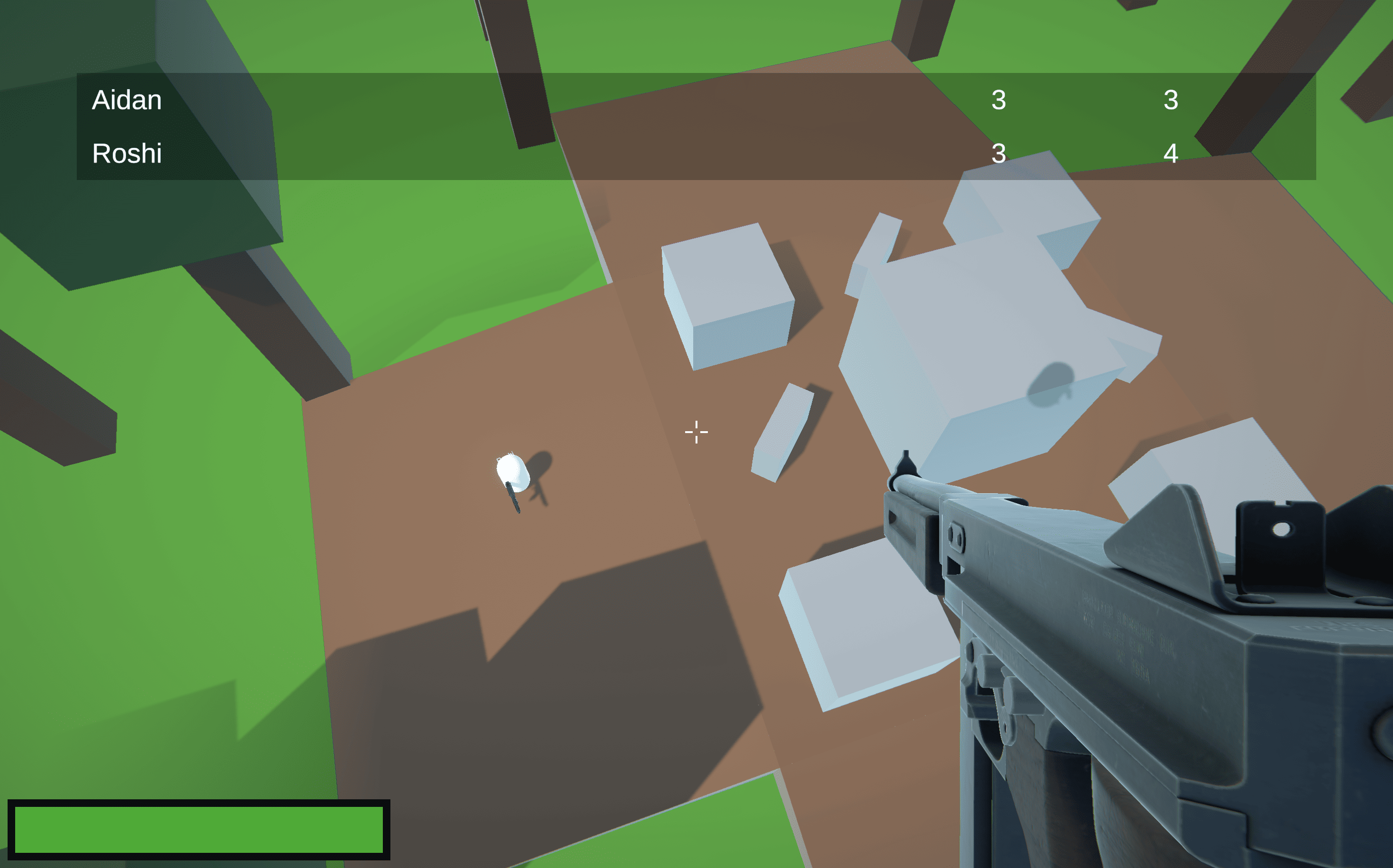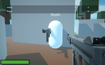 Multiplayer FPS shooter game up to 20 people. Two maps selected at random a forest one and a training one. Click tab to see score board!